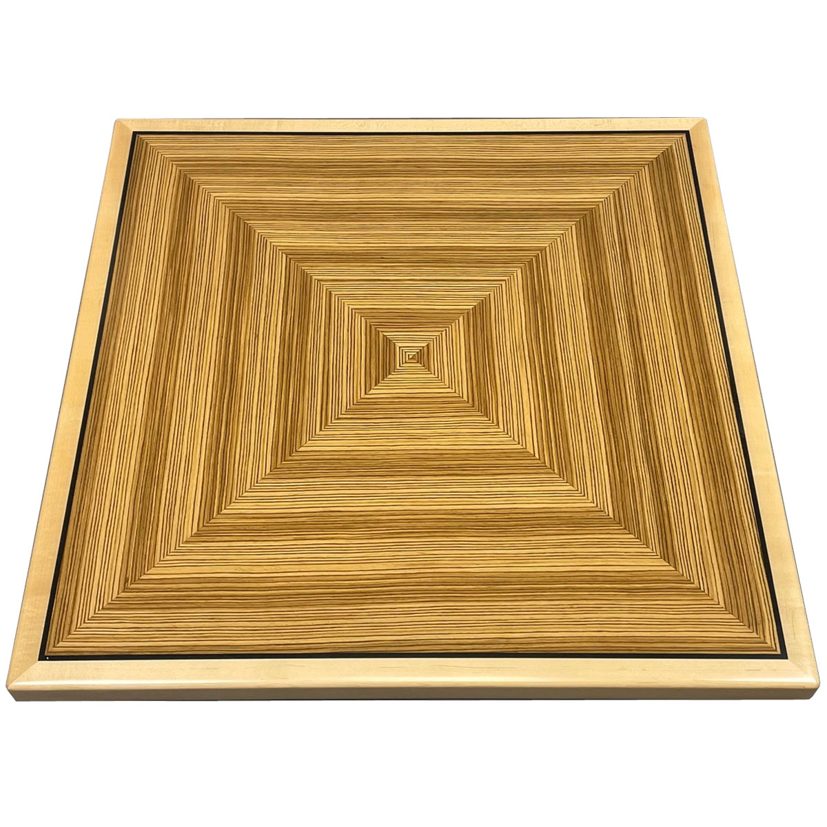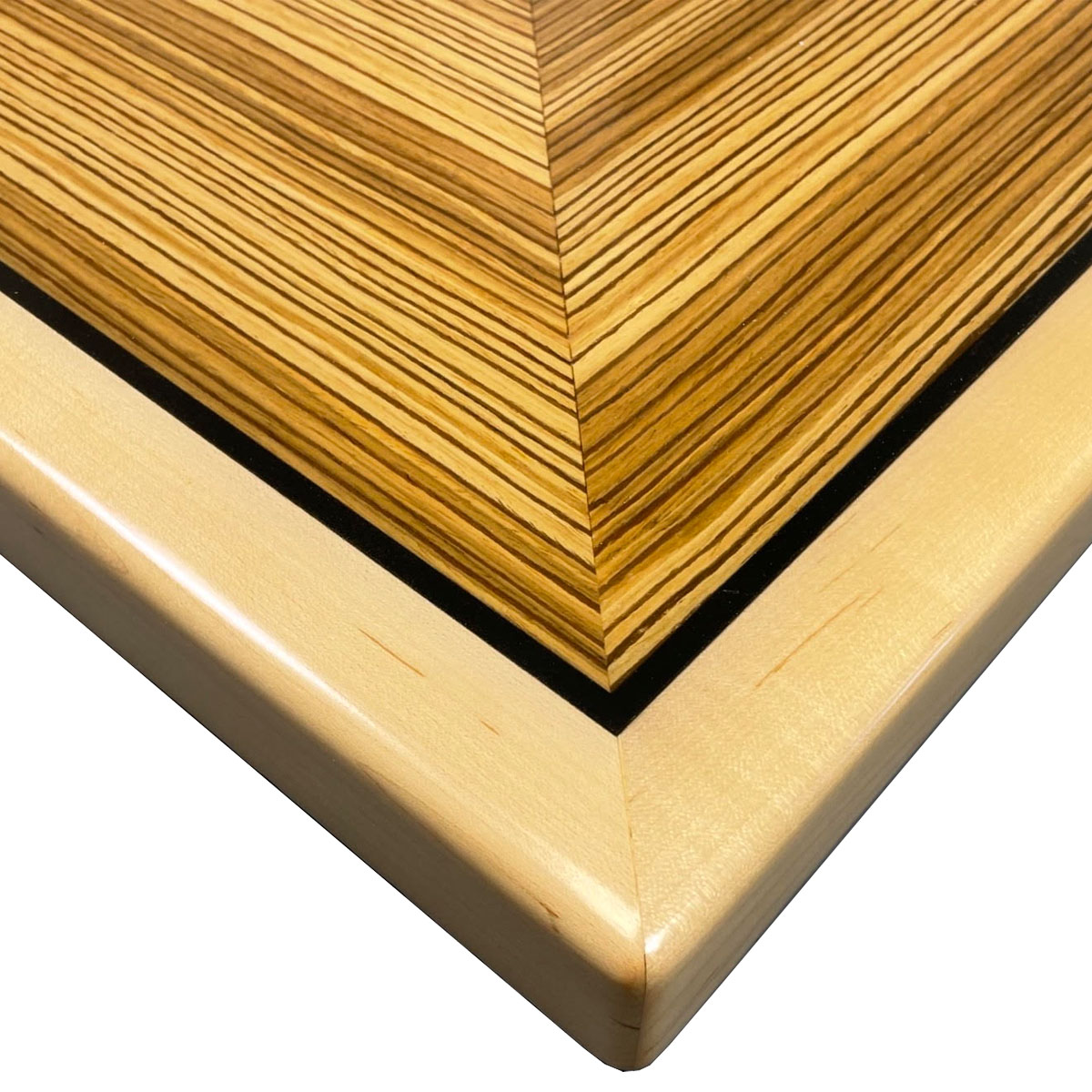 Brookline “Qtr. Zebrawood Veneer” in Box Pattern with ¼” Black Printed Accent Stripe and Natural Maple Wood Edge
