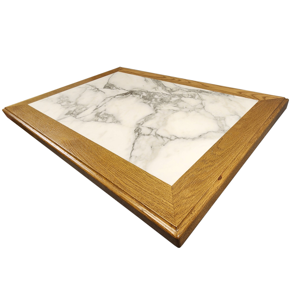 Daltile “Gypsum Calcatta” Inlay with 3″ x 1-3/4″ White Oak Edge, Custom Stain, Ogee Profile, Polyurethane Finish on Wood Edges